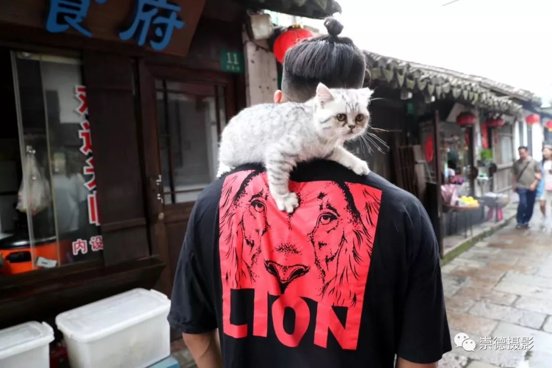 ▲ 5月26日,上海市浦东新区新场古镇,一位身穿体恤衫的大男孩背着一只猫从老街上走过,白色的猫与红色的狮面图案相映成趣。