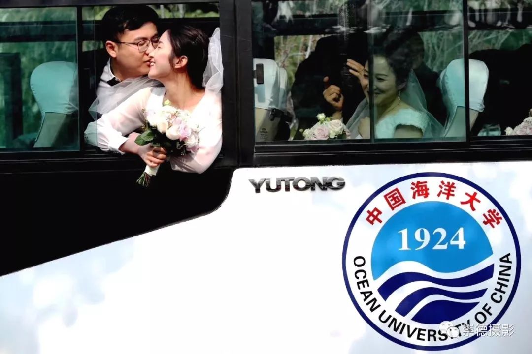 ▲ 4月6日上午,山东省青岛市崂山区,中国海洋大学校友集体婚礼现场,132位校友结成的66对新人乘大巴车来到樱花大道,在樱花树下海誓山盟,共结连理。