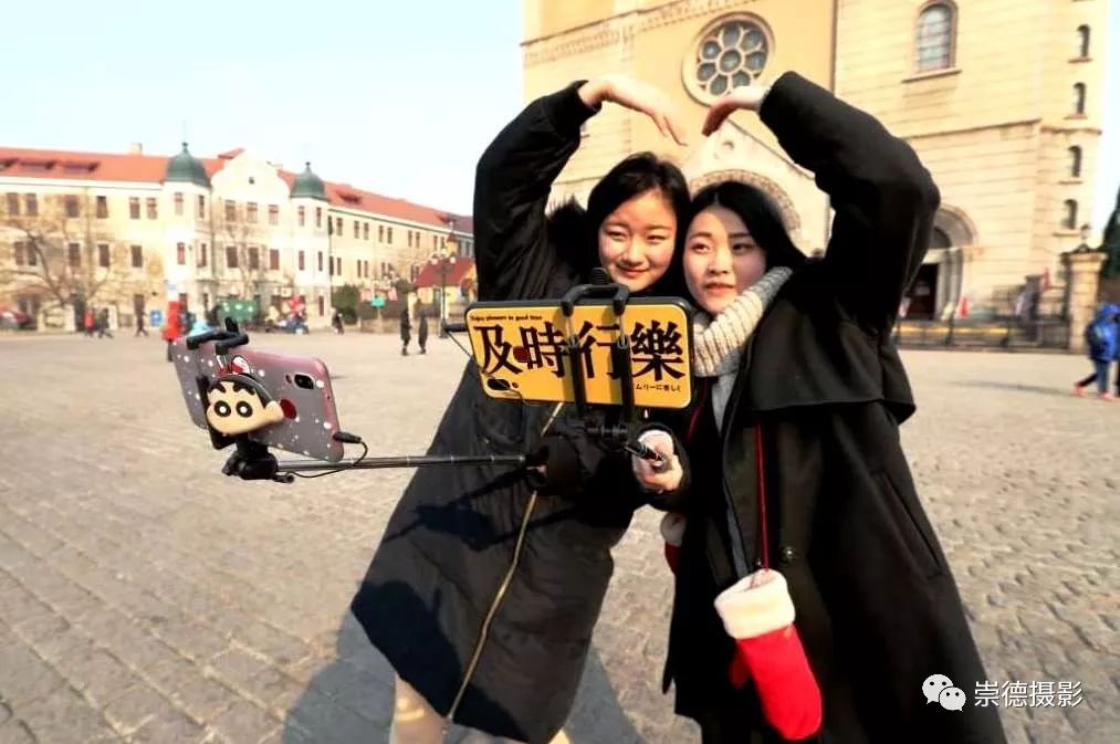 ▲ 1月2日,山东省青岛市浙江路,两位女生用自拍杆自拍,其中一个手机壳上标有“及时行乐”的字样。难道这就是现代青年的生活方式与精神追求?