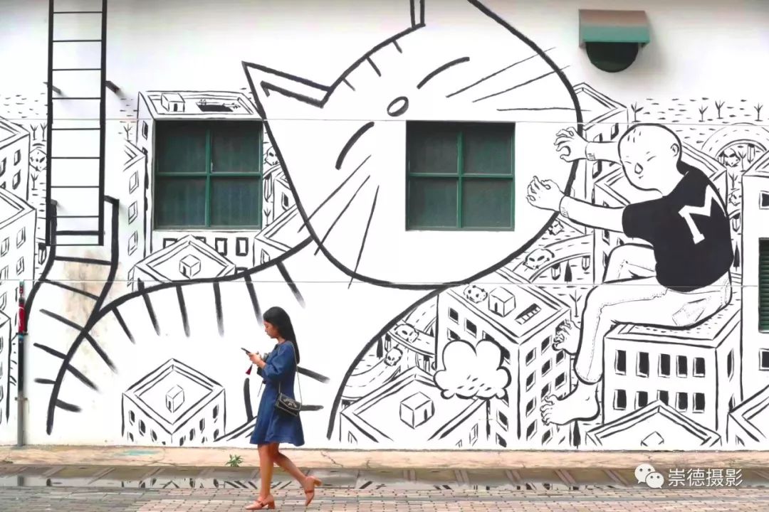 ▲ 7月11日上午,上海市杨浦区大学路,一位身着蓝色连衣裙的年轻女子行走在一面楼墙的巨幅壁画前。