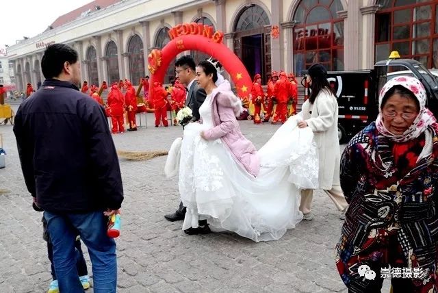 ▲ 3月2日上午,山东省青岛市浙江路,一对拍摄婚纱照的准新人正走过一场婚礼现场。