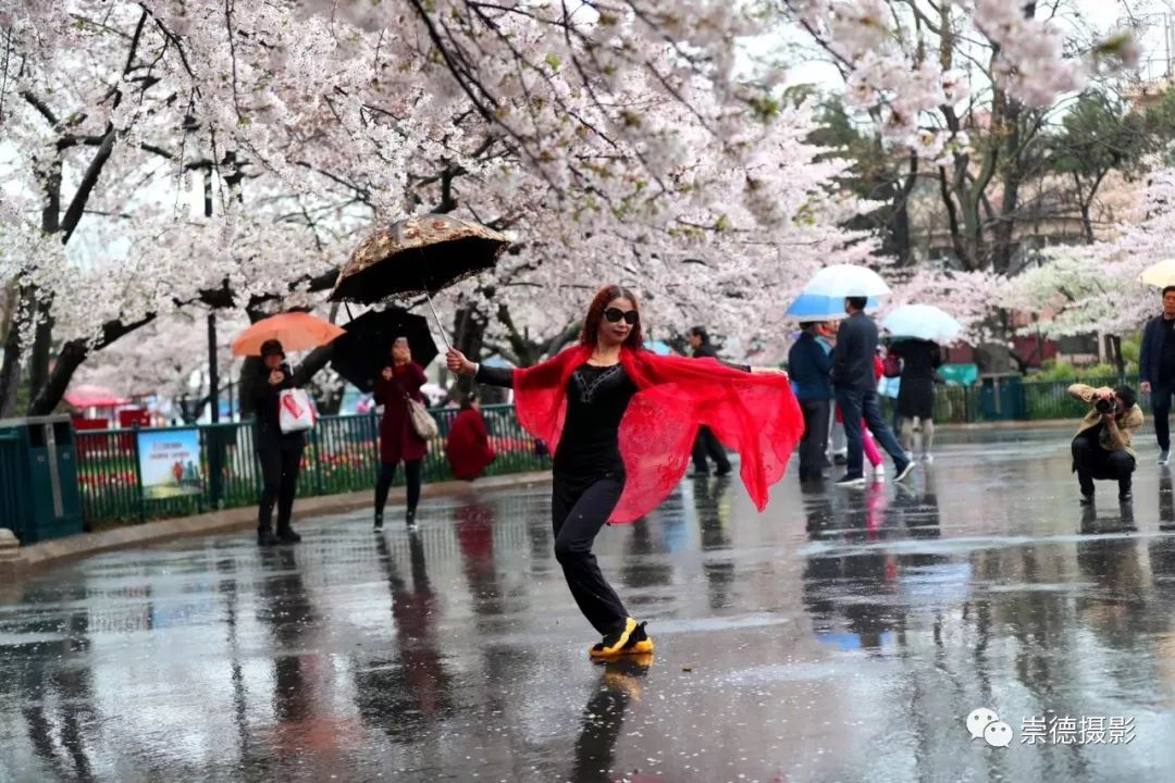 ▲ 4月9日上午,山东省青岛市中山公园,一位丝巾大妈为盛开的樱花所倾情,冒着雨水在樱花树下翩翩起舞……