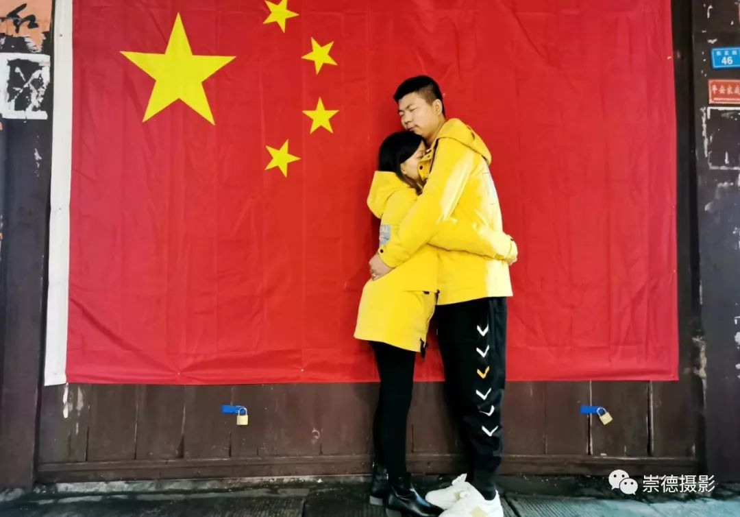 ▲ 10月27日夜晚,湖南省湘西州凤凰县凤凰古城,一对身穿情侣装的恋人在巨幅国旗下拥抱。