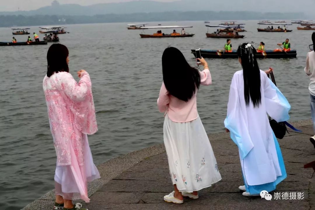▲ 6月1日,浙江省杭州市西湖风景区,三位身穿汉服的年轻女子在湖边拍照。