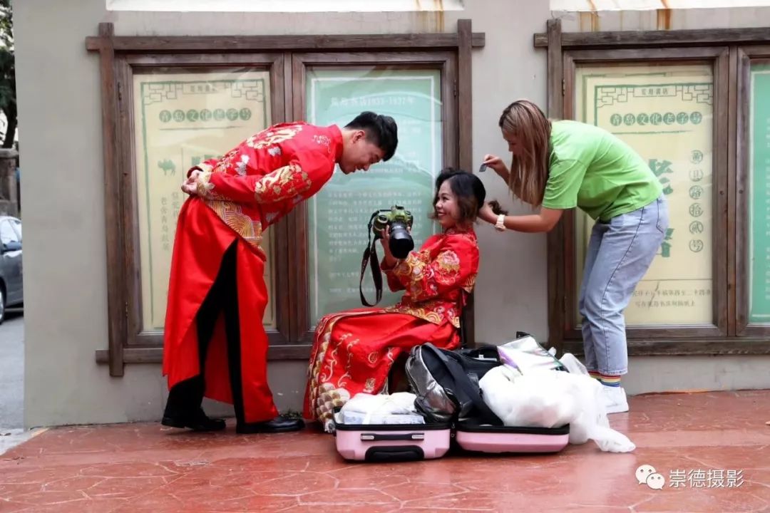 ▲ 9月15日上午,山东省靑岛市黄县路,正在梳头补妆的准新娘拿着相机与准新郎分享刚刚拍摄的婚纱照片。