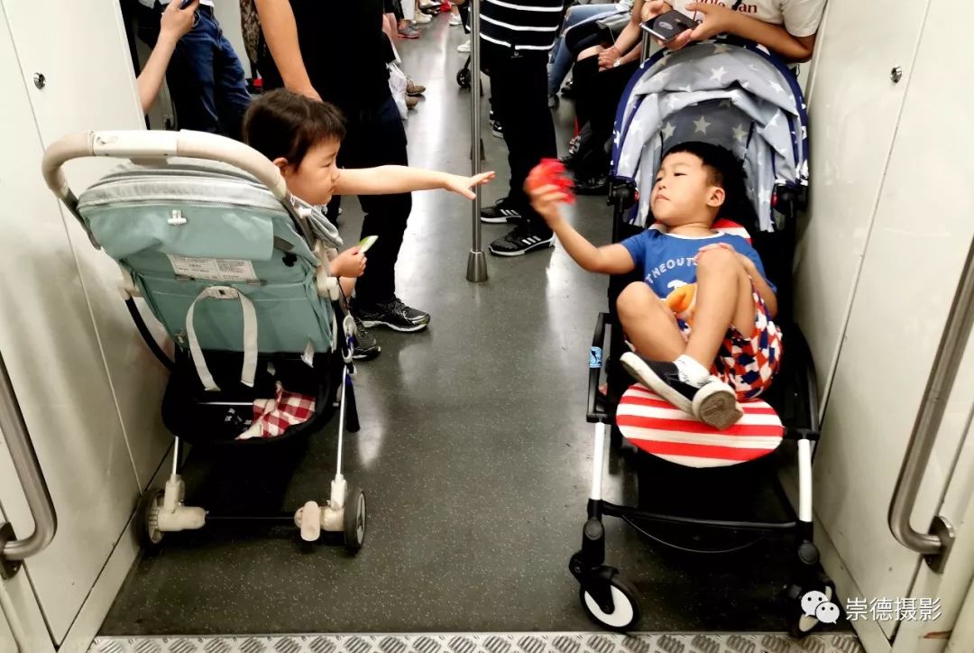 ▲ 7月18日下午,上海市地铁2号线上,儿童车里的两位儿童趁着大人玩手机的间隙在相互交换玩具。