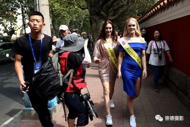 ▲ 9月25日上午,山东省靑岛市大学路,参加2019世界旅游小姐全球总决赛的几位外国模特行走在红墙外。