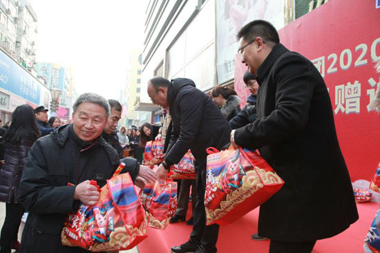 在台东利群商厦发放“大礼包”活动现场,利群集团领导及工作人员将一份份饱含关怀的利群“爱心大礼包”送到到场的近400户困难家庭手中。大米、面粉、鸡、鲅鱼及喜庆的福字,沉甸甸的礼包,情义比年货更重。