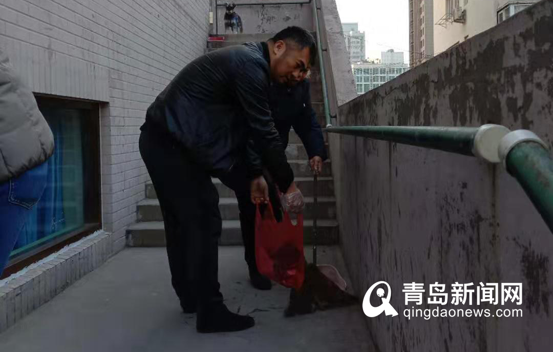 青岛近两天气温骤降,下过雪,楼梯上积满了雪,有的地方结了冰。清早,葛为民准备了融雪剂和铲子,清理路面上的积雪。“我出来清理,大家听见声音也都纷纷的出门帮忙,不一会儿积雪就清理了,大家上下楼梯就不会滑倒了。”葛为民介绍。