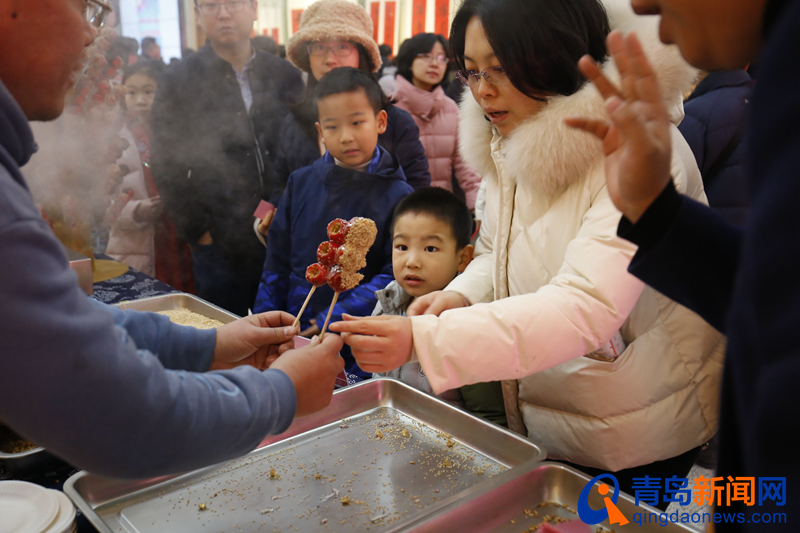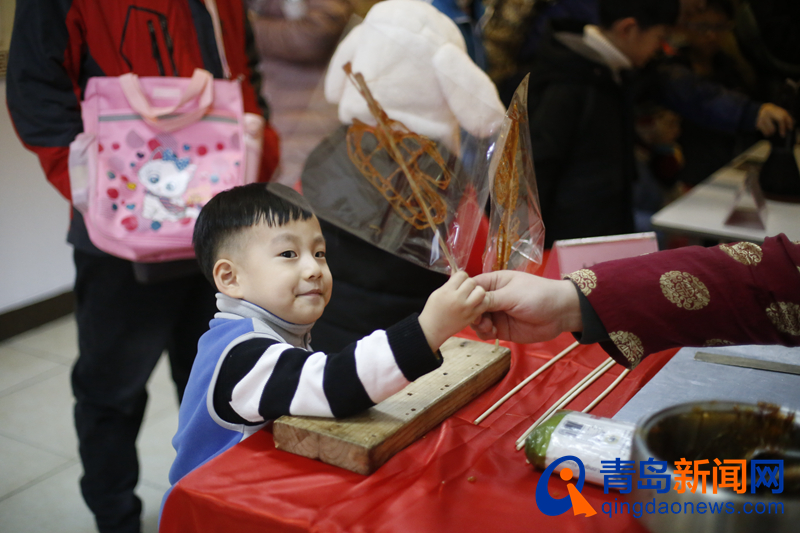 高家糖球制作技艺、流亭大馒头制作技艺、周氏流亭猪蹄制作技艺以及春和楼香酥鸡、荷花酥制作技艺等非遗饮食技艺类项目共同参与,孩子们排起长长的队伍,免费领取、品尝糖球等美味年节美食,用舌尖上的青岛,共同唤起年的记忆、春的味道!