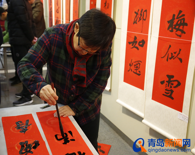 “生肖迎新春送福千万家”是民俗大拜年的传统项目,数位岛城知名书法家在现场挥毫泼墨,按照读者挑选的词句免费为岛城市民写福字、送春联,把美好祝福送进千家万户。拿到春联的群众个个喜笑颜开,迫不及待要回家张贴起来。