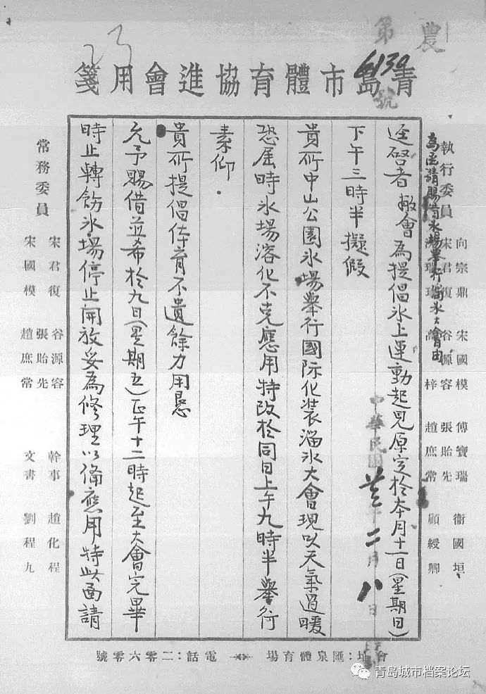 随着1937年底国民党部队全部撤离,1938年1月青岛即被日军占领,由此战乱,那个冬天的溜冰场自然没有正常经营。不过,战争不会浇灭外国人对溜冰运动的强烈需求,所以,1938年12月,青岛治安维持会有公函记载,很多西人询问第一公园溜冰场的事。对此,农林事务所的反应很积极,先呈请“照例免费在溜冰场按时放水”,以便外侨溜冰。后又在1939年1月5日,呈请经费七百七拾四元,以便筹备溜冰场的开放。根据1939年初的档案记载,小西湖溜冰场原来设备在“事变时破坏损失不堪应用”,所以,农林事务所想趁着天寒结冰,及时筹划整理,以便“赶期开放”。这一申请很快得到了维持会会长赵琪的批准。可见,只要青岛的冬天还在,华洋杂处的状况还在,小西湖还在,中山公园的溜冰运动就不会停止。正因为此,转过年的1940年2月4日,小西湖再次举行了规模盛大的化装溜冰比赛。而此时,历史已进入了1940年代。