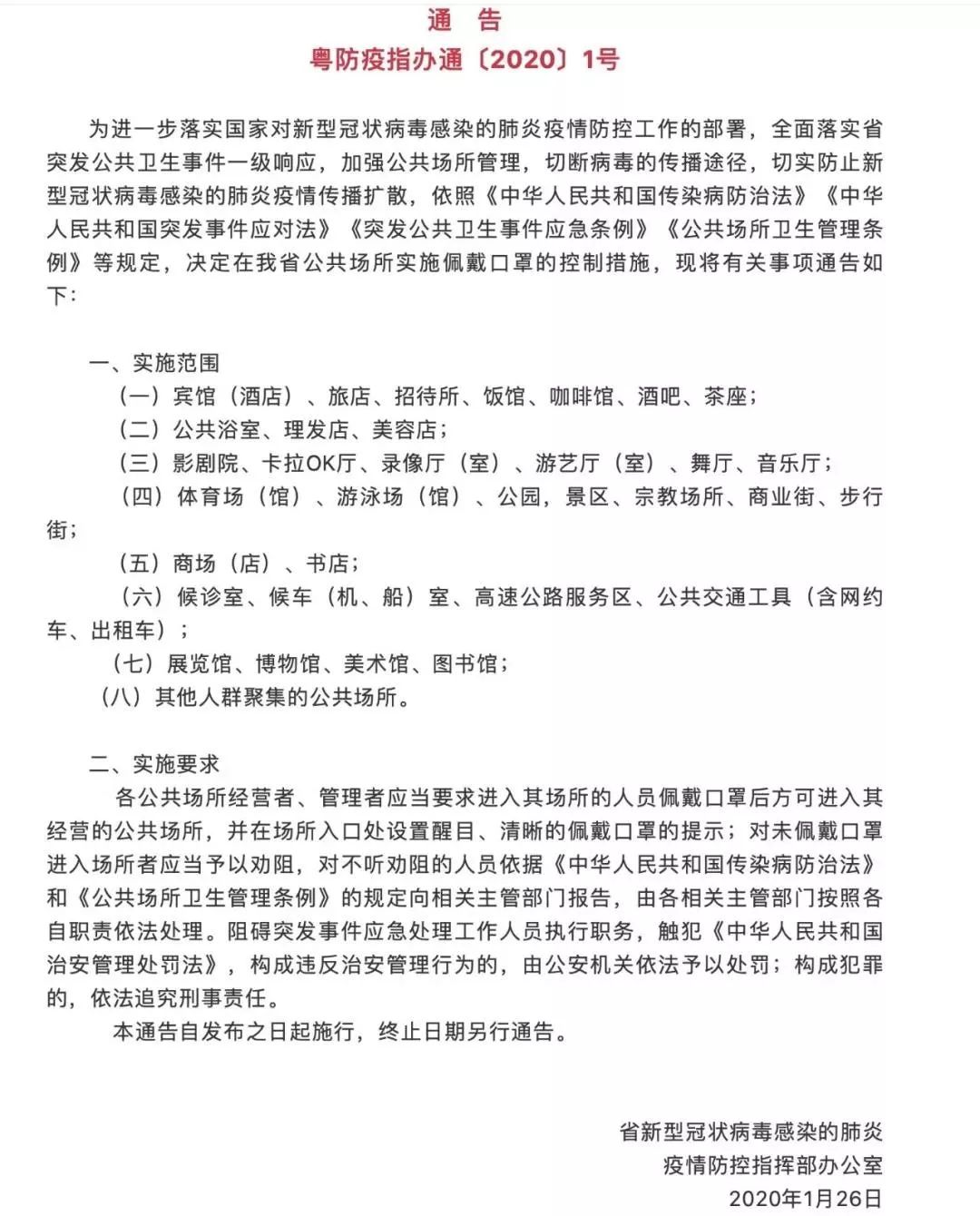 广东省新型冠状病毒感染的肺炎疫情防控指挥部办公室1月26日发布通告,决定在广东省公共场所实施佩戴口罩的控制措施。