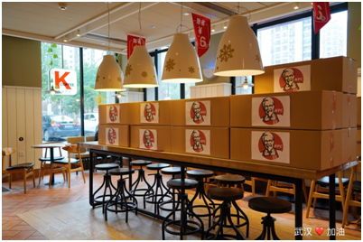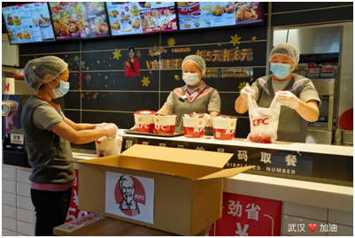 自新型冠状病毒引发的肺炎疫情出现以来,为配合疫情防控工作的需要,保障消费者和工作人员的健康与安全,武汉市、湖北省内其它地市肯德基和必胜客餐厅先后暂停营业。然而,百胜中国的员工一直惦记着奋战在抗击疫情第一线的医疗人员们,希望能够贡献自己的力量。当了解到医护人员存在食品短缺问题,百胜中国立即在武汉启动内部志愿者招募工作,招募微信在公司内部一经发出,响应者非常踊跃。不到一天时间,就有近900名志愿者报名。疫情面前,人心凝聚,激昂之情,令人动容。在武汉市商务局的协调支持下,百胜中国在武汉市内重新开启三家肯德基餐厅和三家必胜客餐厅。重启餐厅,不为生意,只为奋斗在疫情一线的最可爱的人。