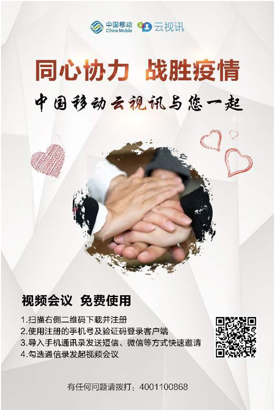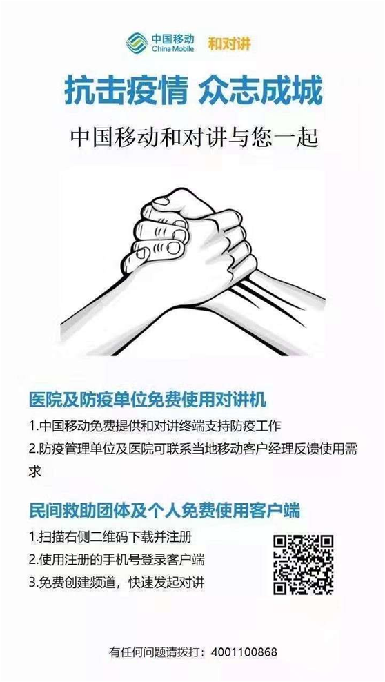 防控新型冠状病毒感染肺炎疫情就是命令、就是责任,中国移动青岛分公司高度重视,全面贯彻落实党中央国务院的重要指示精神,履行企业责任,创新服务方式,积极响应“减少工作聚集、创新办公形式,提倡远程协同”的要求,免费提供“云视讯”远程视频服务、“和对讲”实时调度应用。做好通信和服务保障,全力支持前线防疫抗灾。