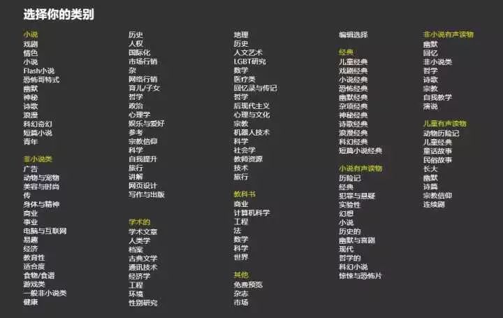 分类非常多且详细,不管是小说还是非小说,学术文章还是教科书,经典书籍还是有声读物,都可以在这里找到精确的分类。