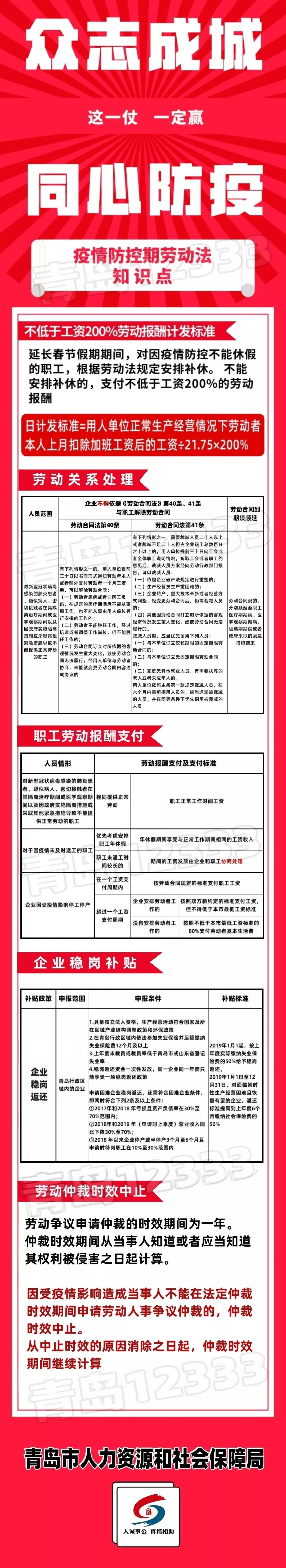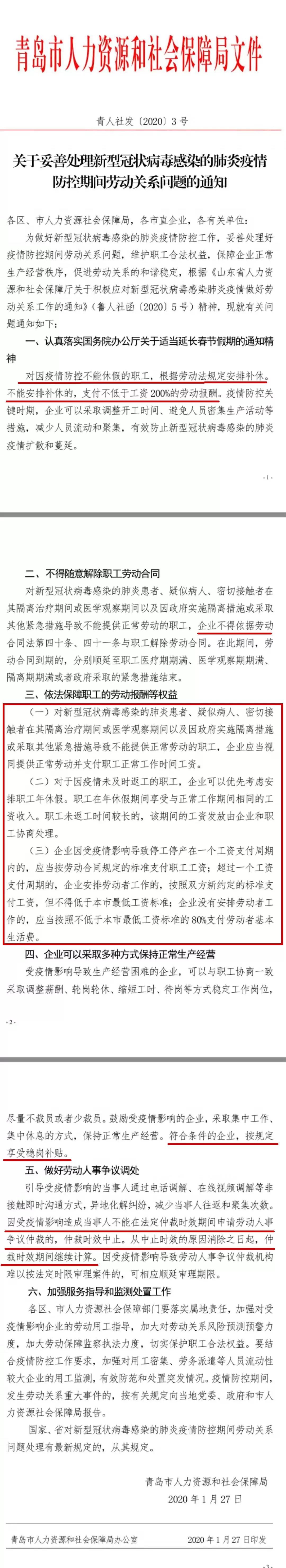 2020年1月27日,青岛市人力资源和社会保障局发布《关于妥善处理新型冠状病毒感染的肺炎疫情防控期间劳动关系问题的通知》。