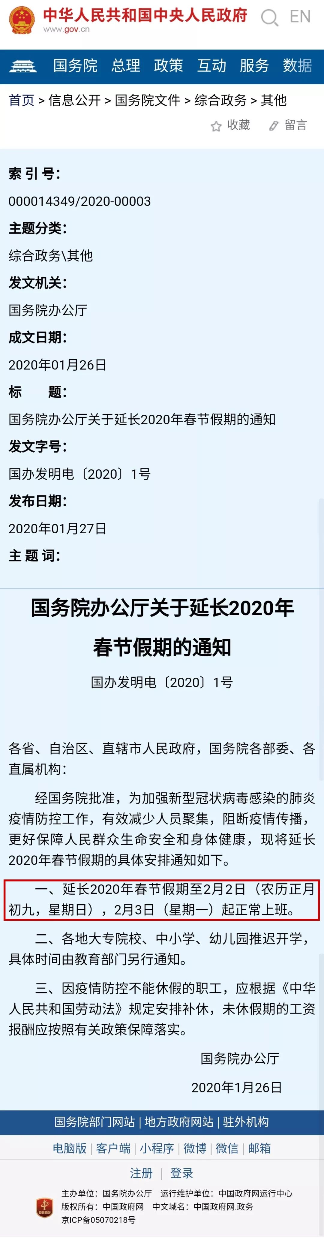 2020年1月27日,为有效减少人员聚集,阻断疫情传播,国务院办公厅发布《关于延长春节假期的通知》,延长2020年春节假期至2020年2月2日。