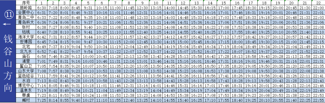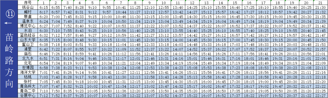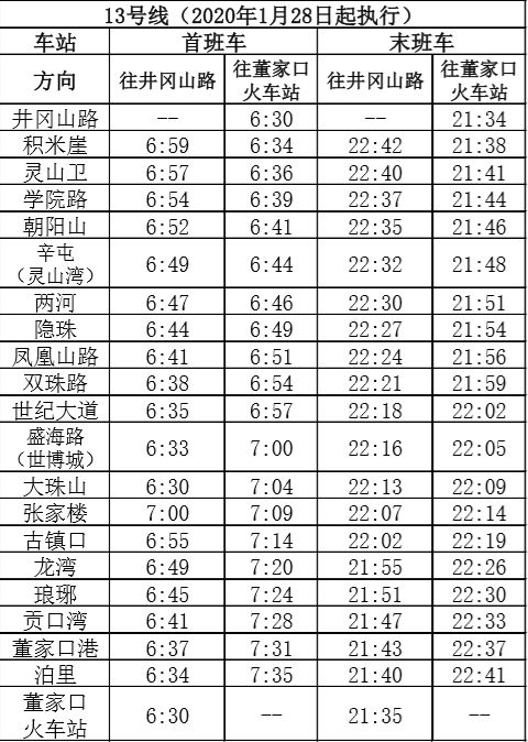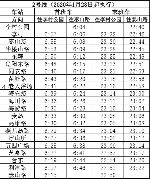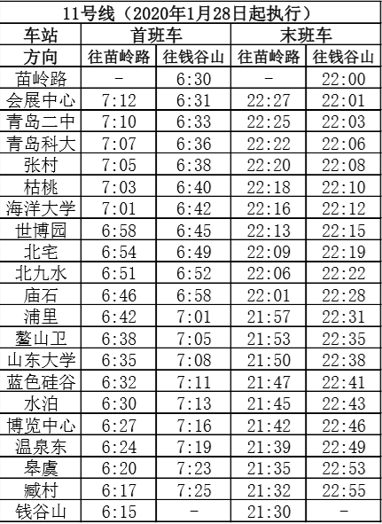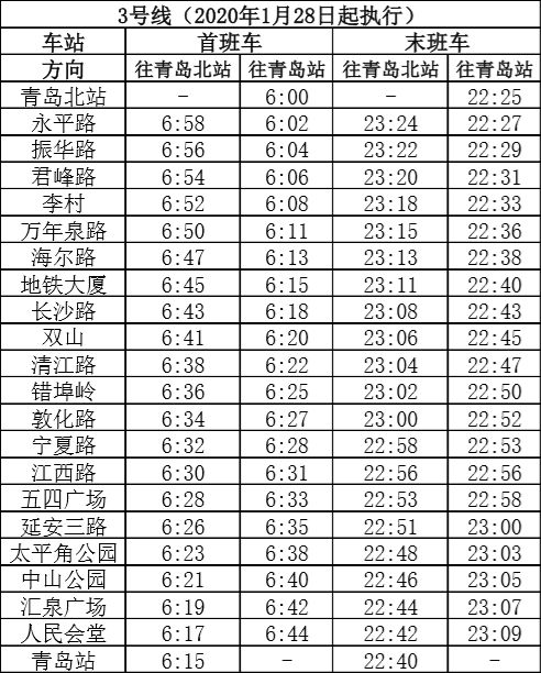 根据青岛市疫情防控工作部署,青岛地铁于1月28日(正月初四)起对2、3、11、13号线列车运行图进行调整,加大行车间隔。为避免乘客在站等待时间过长,针对近期执行的较大间隔特殊运行图(2、3号线行车间隔约25分钟,11号线行车间隔约45分钟, 13号线行车间隔约50分钟),青岛地铁制作了列车运行时刻表,方便乘客乘车,现将各线路首末班车时刻表和列车运行时刻表公布如下。青岛地铁提醒您:列车实际运行时刻与表中计划时刻可能存在微小差异,乘车时请预留一定的时间。