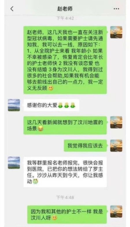 “赵老师,如果需要护士请先通知我,我可以去一线,原因如下: