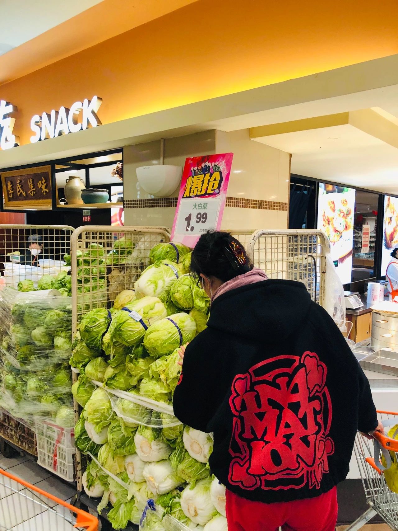 超市人最多的就是食品类柜台,肉食、面食、水果还有蔬菜……