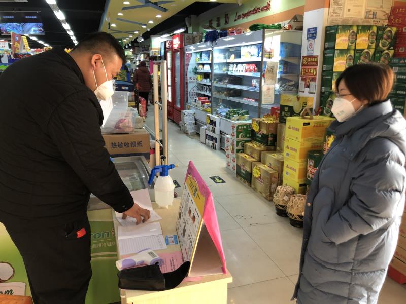 实施进出人员管控。要求超市、药店在每个出入口设置体温检测指示牌和检测点,安排专人对每名员工及顾客进行体温检测。同时,要求超市工作人员测量体温进行登记时要做到三问:一问是哪里人,近14天是否去过湖北尤其武汉。二问近14天是否有接触湖北人员接触史。三问家人是否有发烧咳嗽等呼吸道感染症状。