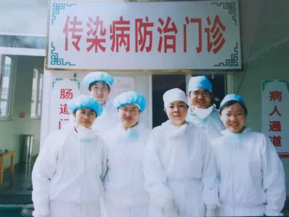 △2003年,张红(一排左一)、陈爱美(一排左二)和同事抗击非典胜利后合影。