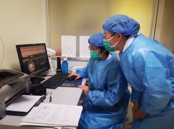 △张红(左)和陈爱美(右)查看患者CT检查影像