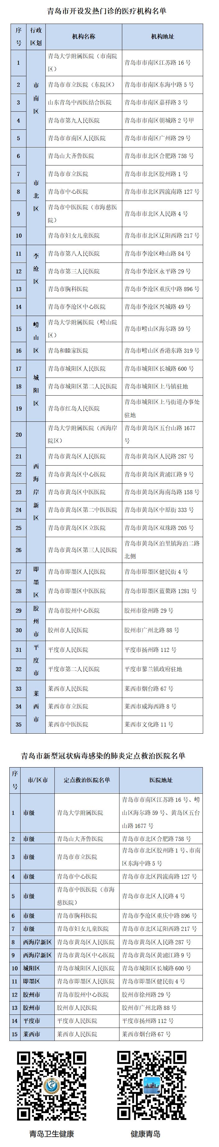 2020年2月2日12—24时,我市新增1例新型冠状病毒感染的肺炎确诊病例。 新增确诊患者,59岁女性,现住即墨区,1月1日前往湖北荆州探亲,1月8日自驾回到即墨,2月1日到医院发热门诊就诊。经市疾控中心核酸检测和专家组评估,2月2日下午确诊。现已对6名密切接触者开展医学观察,目前无发热等异常情况。其他密切接触者正在进一步追踪和调查中。 截至2月2日24时,我市累计确诊25例新型冠状病毒感染的肺炎病例,其中重症2例,危重症1例,治愈出院1例,患者均在定点医院接受隔离治疗。累计已排除疑似病例74例,现有疑似病例21例,正在隔离检测治疗。累计已解除医学观察26人,仍纳入医学观察的密切接触者342人,未发现异常。 目前按病例确诊医院所在区市分布:市南区1例(已治愈出院)、市北区4例、李沧区2例、崂山区2例、城阳区1例、黄岛区8例、即墨区3例、胶州市1例、平度市2例、莱西市1例。 青岛市开设发热门诊的医疗机构名单 青岛市新型冠状病毒感染的肺炎定点救治医院名单 (点击下方图片可查看大图)