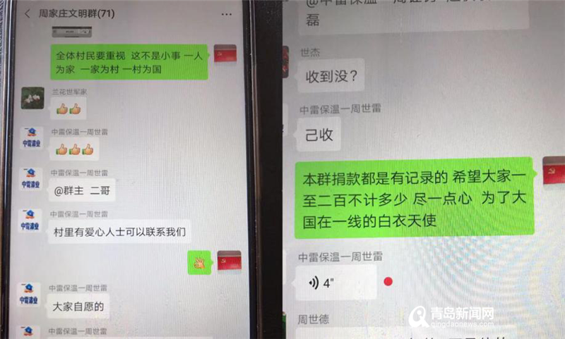 湖北是本次疫情的重灾区,疫情严重和物资短缺的报道一直牵动着周家庄村民的心。村民们想为湖北人民做些力所能及的事情,这个想法汇集到村党支部书记这里。捐款在微信群里发起,一呼百应,一笔笔善款带着村民的爱纷至沓来。“帮一点是一点”“不多,就是个心意”“都不容易”……简单的表达饱含浓情厚意!全村共筹集到3450元善款,通过正规渠道全部捐给湖北抗击疫情前线!
