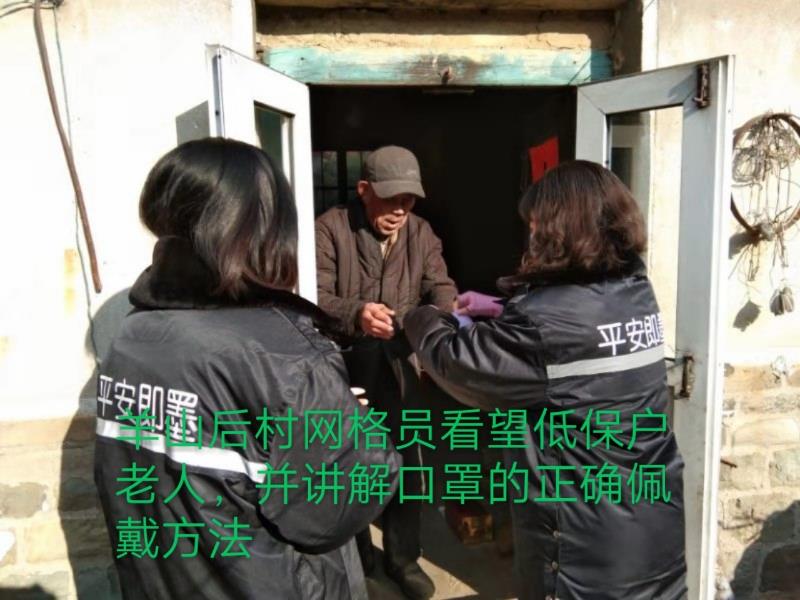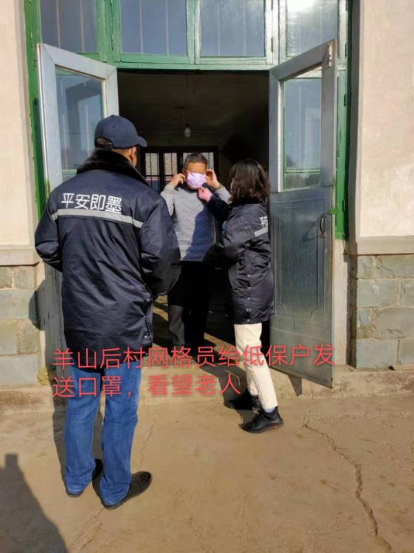 羊山后村网格员刘爱君,上门为低保户老人送上口罩,并耐心讲解口罩正确戴法。