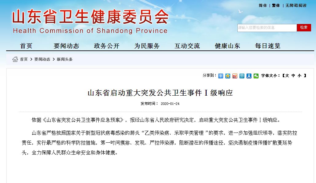 1月24日,山东省决定启动重大突发公共卫生事件一级响应。