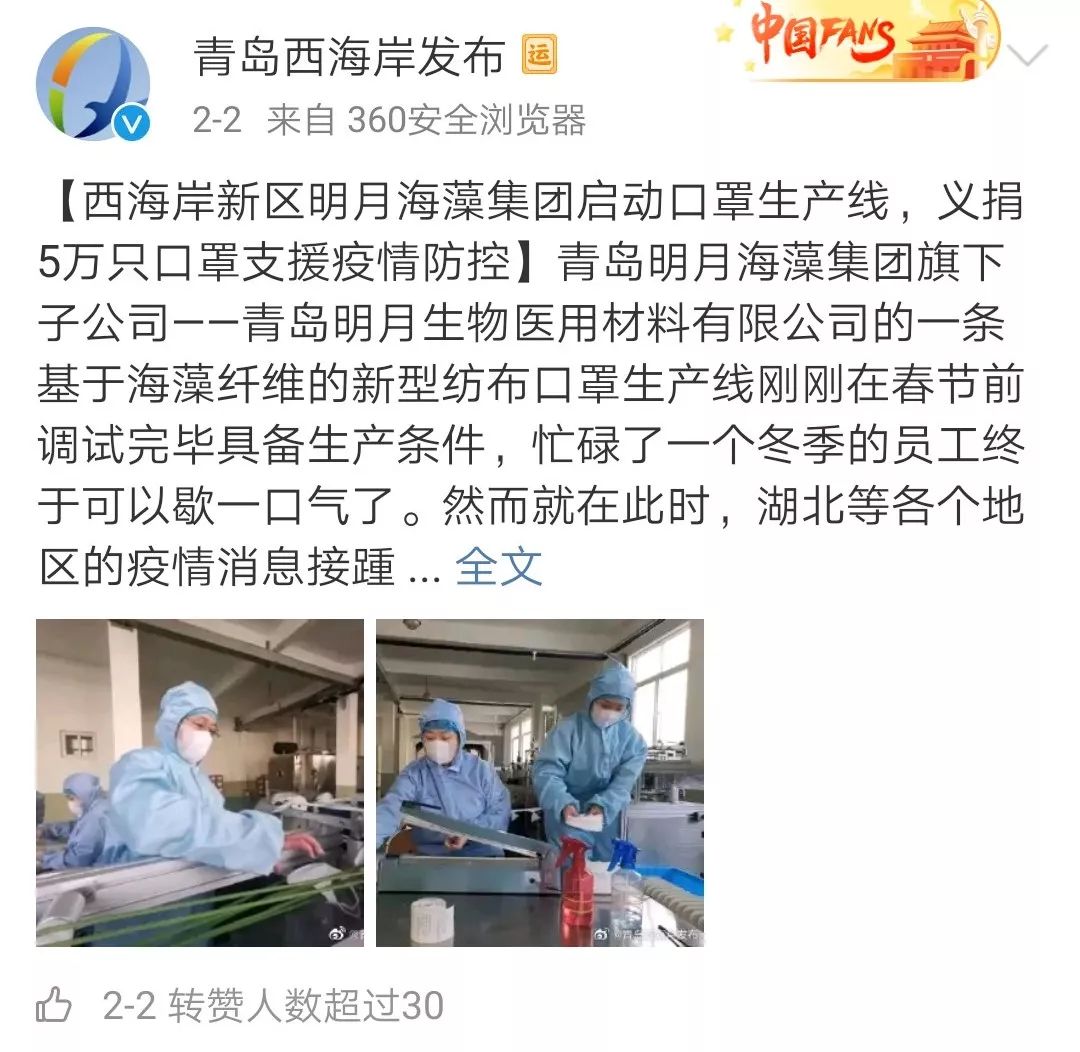 西海岸新区明藻集团的员工大年初一就接到开产通知,启动口罩生产线。