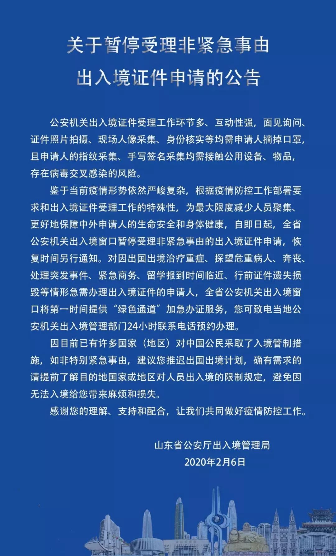 恢复非紧急事由出入境证件申请的受理时间另行通知。我局将通过本公众号向社会群众及时转发、推送相关政策规定和工作通知,请注意关注。