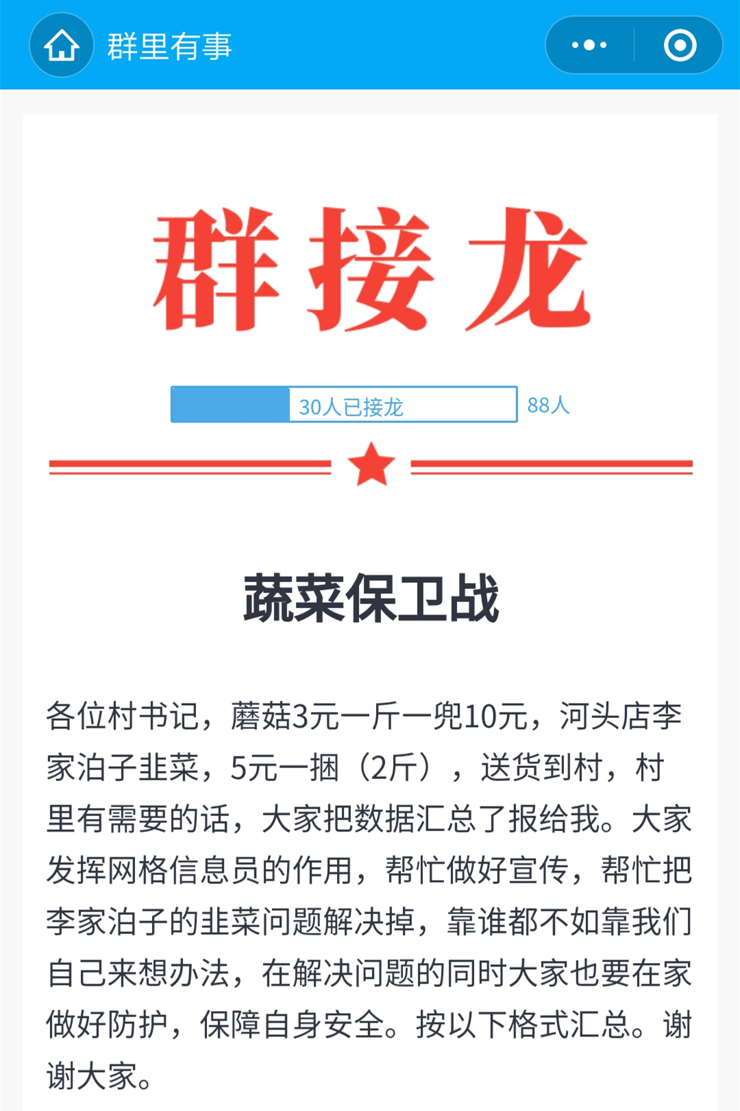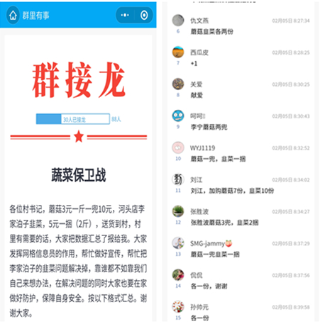 河头店镇是农业大镇,农产品种类丰富,辖区内有蔬菜专业村,有水果专业村,同时,各村老百姓以及机关干部对各类农产品有不同的需求,与草莓规模化生产、统一销售相比,散户种植农产品销售难度无疑大了许多,针对这种情况,河头店镇积极运用平台思维,搭建网销平台,利用微信小程序统计各村滞销农产品数量,通过微信群转发宣传、二维码收款、实行统一配送,解决散户蔬菜销售难问题,在减少村民外出的同时,帮助种植户解决销售难问题。以2月5日为例,仅仅一天时间,河头店镇利用镇域产销平台销售蘑菇1800多斤、韭菜2300多斤,远远超出河头店镇散户蘑菇、韭菜一天的产量。