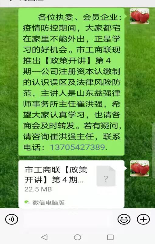疫情防控关键时期,大部分企业家都宅在家里不能外出,正是沉下心来学习政策的好机会。莱西市工商联适时推出《政策开讲》第4期---由山东益强律师事务所主任崔洪强主讲的《公司注册资本认缴制的认识误区及法律风险防范》讲课音频,通过微信发送到市工商联镇(街)商会秘书长群、执委群和直属商会群,并请镇(街)商会秘书长转发到镇(街)商会群,引导企业家在家中收听学习。