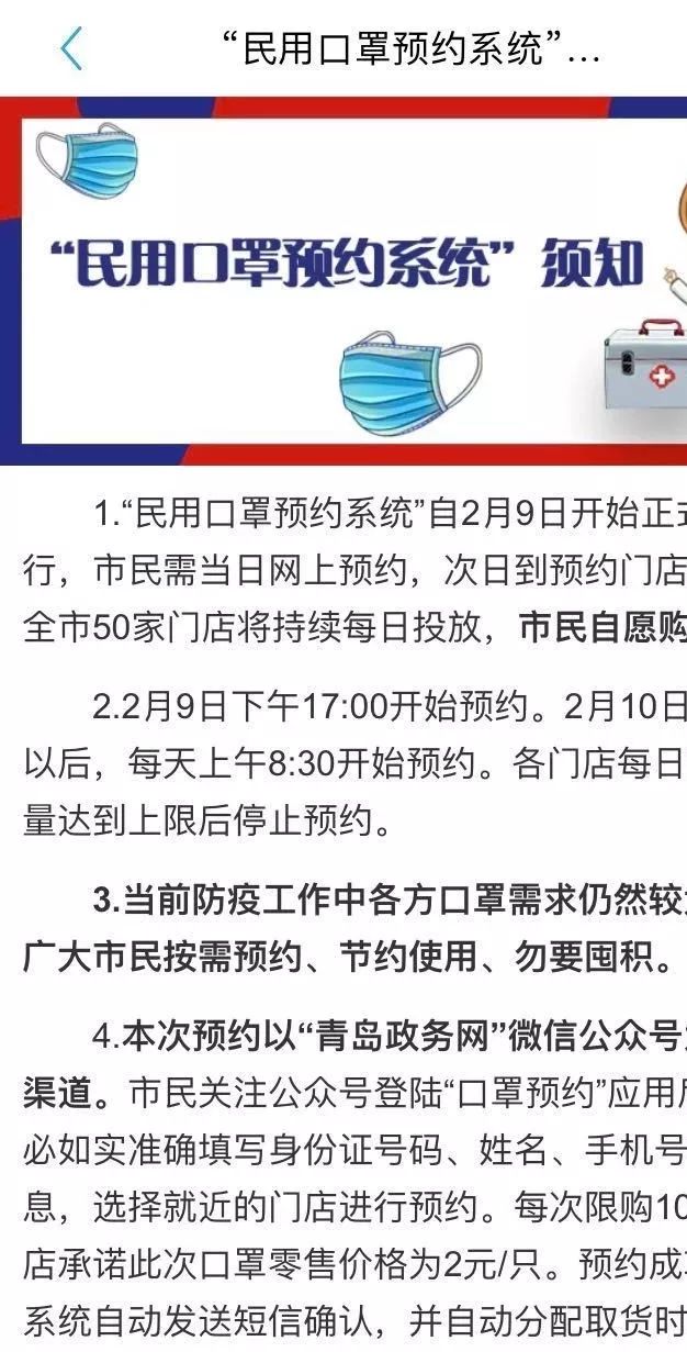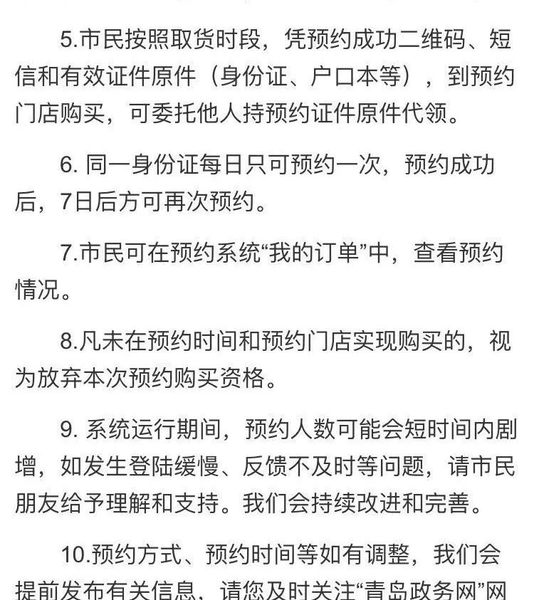 2.2月9日下午17:00开始预约。2月10日(含)以后,每天上午8:30开始预约。各门店每日预约数量达到上限后停止预约。3.当前防疫工作中各方口罩需求仍然较大,请广大市民按需预约、节约使用、勿要囤积。4.本次预约以“青岛政务网”微信公众号为唯一渠道。市民关注公众号登陆“口罩预约”应用后,务必如实准确填写身份证号码、姓名、手机号码等信息,选择就近的门店进行预约。每次限购10只,门店承诺此次口罩零售价格为2元/只。预约成功后,系统自动发送短信确认,并自动分配取货时段。5.市民按照取货时段,凭预约成功二维码、短信和有效证件原件(身份证、户口本等),到预约门店购买,可委托他人持预约证件原件代领。6.同一身份证每日只可预约一次,预约成功后,7日后方可再次预约。7.市民可在预约系统“我的订单”中,查看预约情况。8.凡未在预约时间和预约门店实现购买的,视为放弃本次预约购买资格。9.系统运行期间,预约人数可能会短时间内剧增,如发生登陆缓慢、反馈不及时等问题,请市民朋友给予理解和支持。我们会持续改进和完善。10.预约方式、预约时间等如有调整,我们会提前发布有关信息,请您及时关注“青岛政务网”网站和微信公众号有关公告。