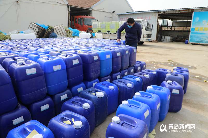 2月9日上午,五辆大卡车停在位于青岛西海岸新区滨海街道办事处的金海洋日化有限公司厂区大门外,厂区内一桶桶包装好的84消毒液整齐排列在一起,六七名员工正在准备装车。这几天,企业正加班加点,尽最大努力为抗击疫情提供足够多的消毒液。