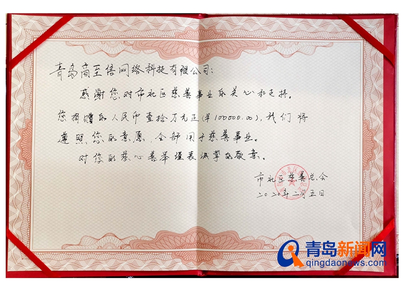 武汉疫情严重,岛城的防控工作同样严峻,随着疫情形势的逐渐发展,各项物资日益紧张。近日,一笔十万元的捐款汇到了市北区慈善总会的账户中,这笔款项将被用于防疫抗疫战斗中最需要的地方,为青岛市抗疫一线的战士们购置医用防护用品,而捐赠这笔款项的,正是宁夏路街道辖区的爱心企业——青岛商至信网络科技有限公司。