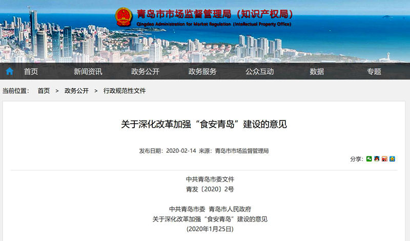 青岛新闻网2月14日讯(记者 黄晓)“民以食为天,食以安为先。”近年来,党中央、国务院高度重视食品安全工作,在全国范围内开展了食药安全“四个最严”专项行动。青岛也积极贯彻落实“四个最严”要求,打造“食安青岛”品牌,成功创建为国家食品安全示范城市、国家农产品质量安全市。1月25日,青岛市发布了《中共青岛市委、青岛市人民政府关于深化改革加强“食安青岛”建设的意见》(以下简称《意见》),紧密结合青岛实际,为当前和今后一个时期加强食品安全工作指明了方向,对推动青岛食品安全治理体系和治理能力建设做出了全面部署。