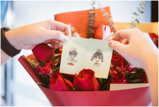“没有什么特别的礼物,就是想告诉她最近辛苦了,我们一起努力,为爱坚守,肯定会胜利!”2月14日一早,庄震就准备好了一份小礼物,并亲手画下两个卡通人物,他们两个人。平时的庄震不喜欢肉麻的情话,但这次他特意在画上留下一个“小心思”——两个卡通人物都各画上了一个小红帽,它不仅代表必胜客的“红屋顶”又代表着一颗心。“既是对情人节的表白,也是对她与我一路同行、心心相印的感激。”庄震说。