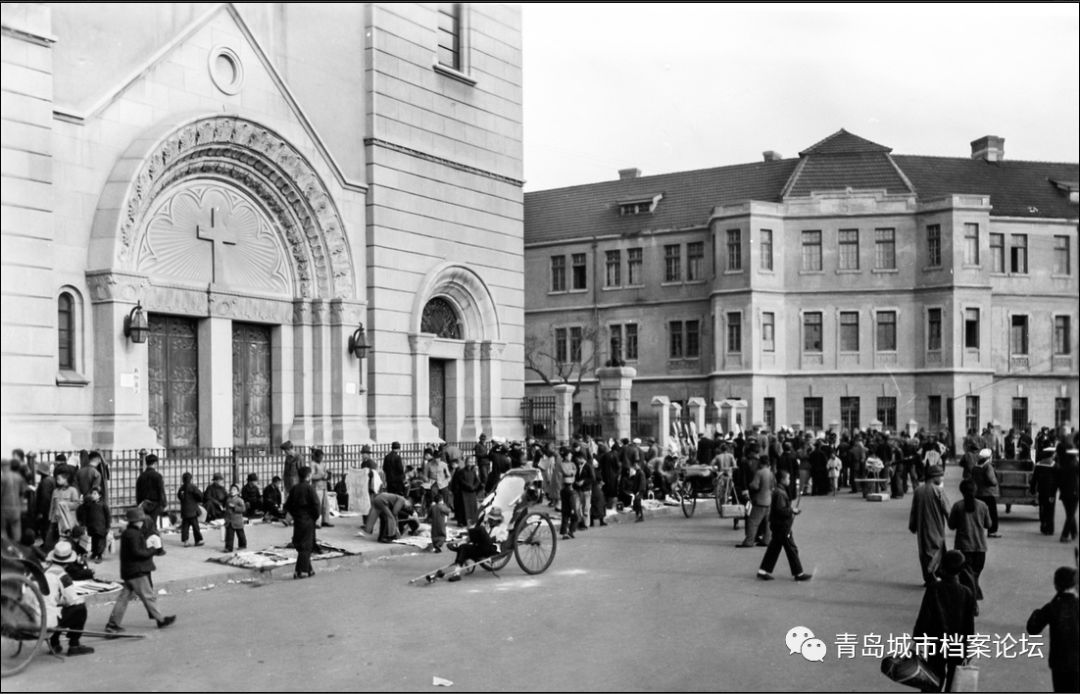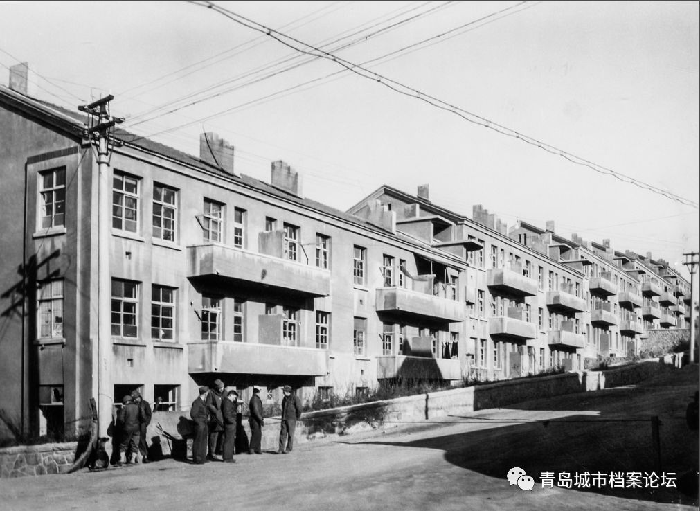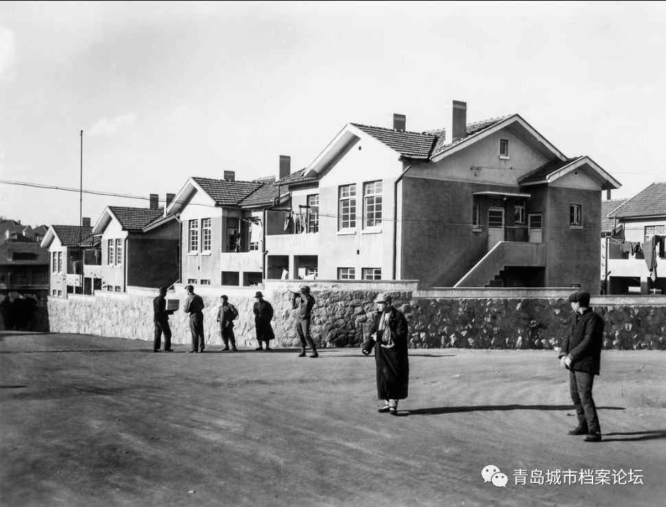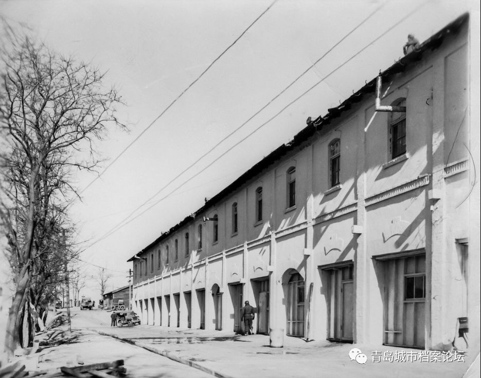 合江路山东大学第二公舍,前身为1940年代日本人建的大型多层公寓,抗战胜利后,美军登陆青岛,临时作为美军兵营。图为美军在日本公寓前。