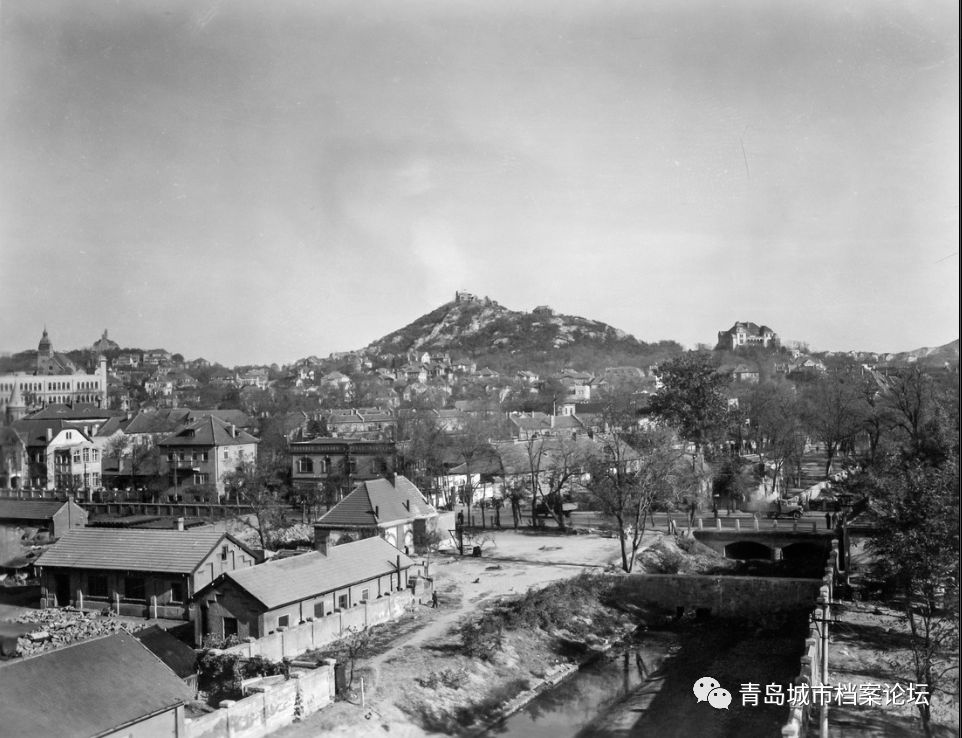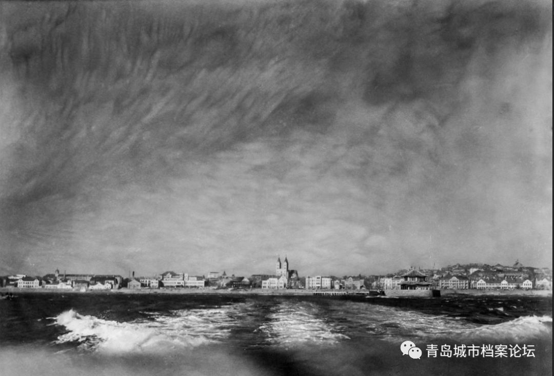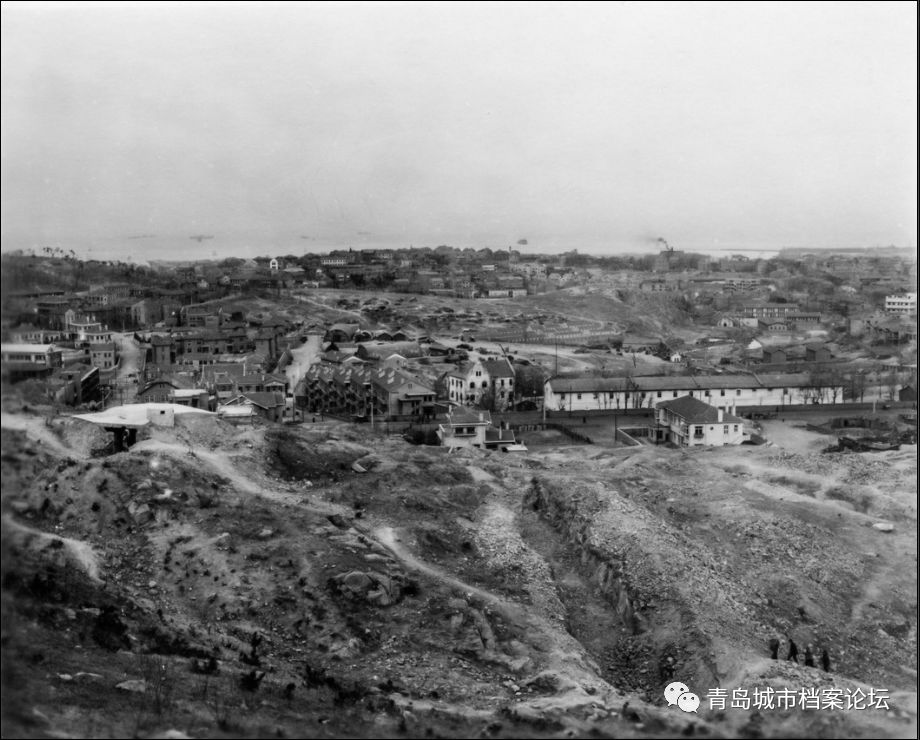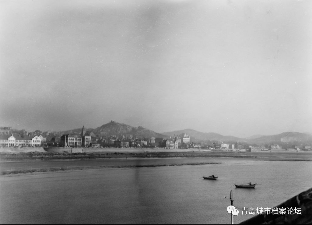从青岛山俯瞰日本公寓,可以看到胶州湾中的美国军舰
