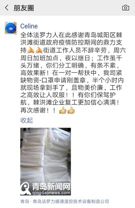 青岛新闻网2月18日讯(通讯员 张美琴)“街道工作人员不辞辛劳,周六周日加班加点,你们分工明确,有条不紊,高效果断!在一对一帮扶中,我司紧缺物资——口罩申请刚盖章,半小时内就现场拿到手了,且物美价钱,工作之高效让人叹服!”这是一条来自青岛法罗力暖通温控技术设备制造公司工作人员发出的朋友圈,点赞棘洪滩街道为企业的顺利复工排忧解难,称“有你们保驾护航,棘洪滩企业复工更加信心满满!”