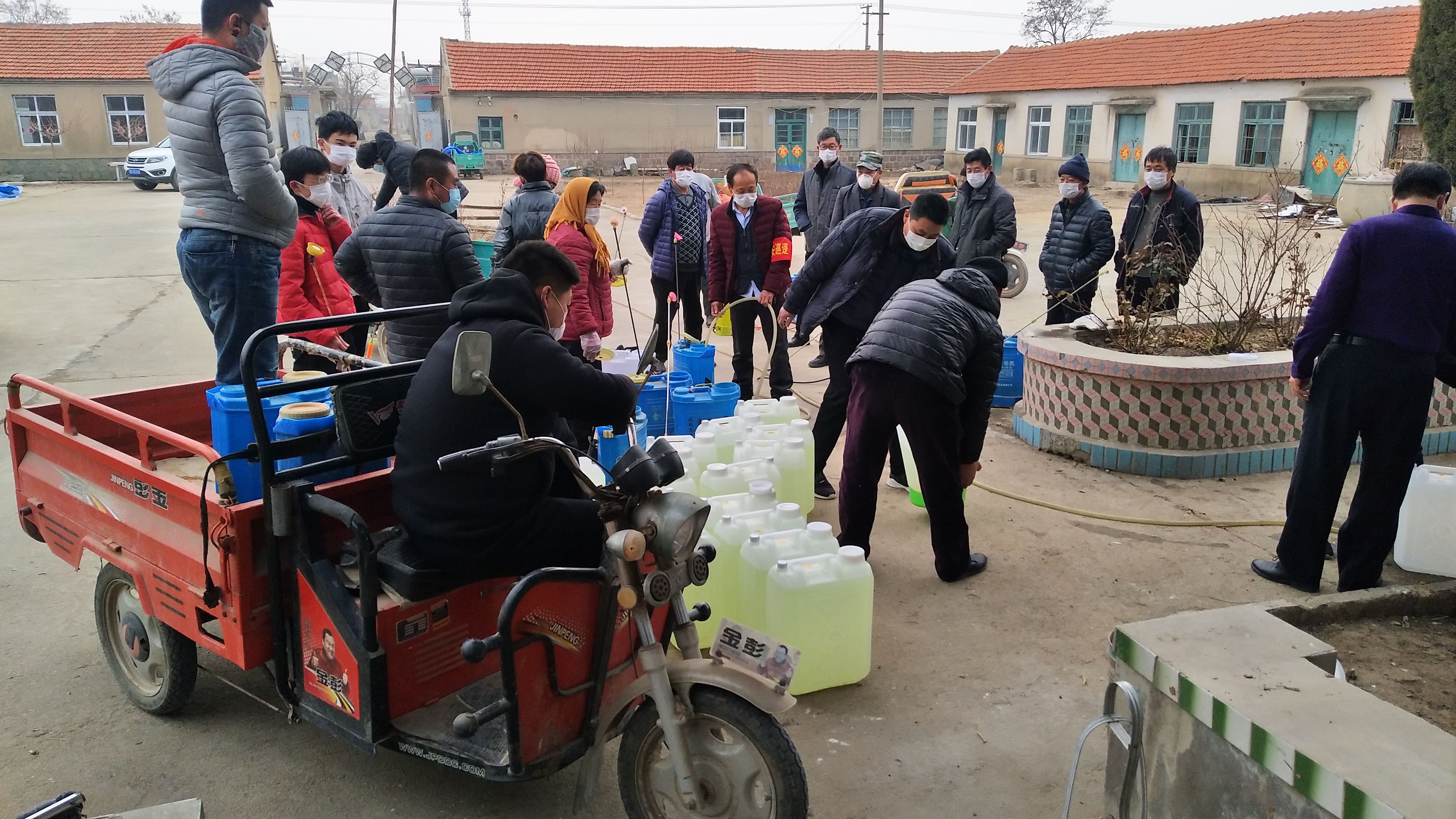 店东村村民自带喷雾器到村委领取消毒液,并对全村的大街小巷进行全面消毒。