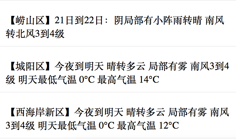 江敦双 市气象台首席预报员:“21号白天我市大部分地区阴有小阵雨,南北风交替出现,风力三到四级,21号受股弱冷空气的影响,气温变化略有起伏,21号最低气温市区及沿海地区四到五度,内陆地区最低三度。”