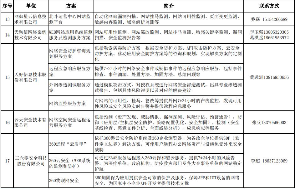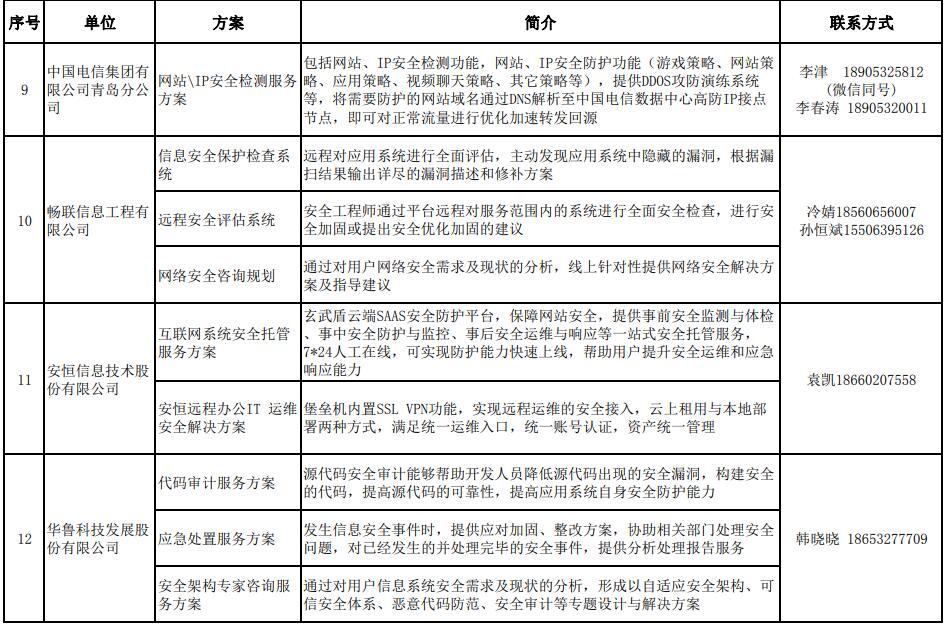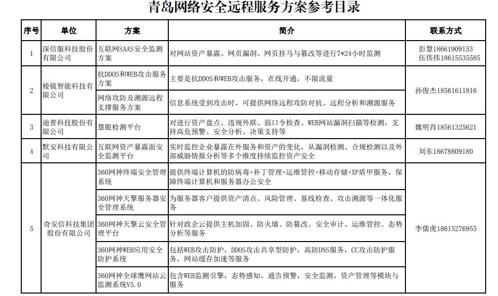 为支持鼓励各网络运营单位及其主管部门做好特殊时期的网络安全工作,市委网信办和市公安局公开征集了一批以网络安全测试、监控、处置等远程服务为主体的解决方案,形成了《青岛网络安全远程服务方案参考目录》,现予以公布。各单位可结合实际自主选择对接,减少现场处置网络安全事件可能的感染风险。如有好的解决方案或典型案例请适时反馈(swwxbwxc@qd.shandong.cn)。