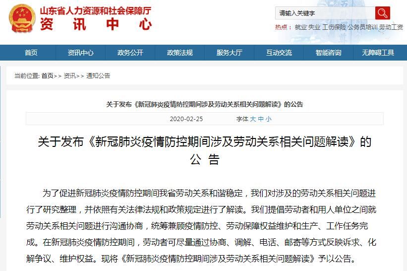 为促进新冠肺炎疫情防控期间山东省劳动关系和谐稳定,山东省人力资源和社会保障厅于2月25日发布公告,对涉及的劳动关系相关问题进行研究整理,并依照有关法律法规和政策规定进行解读。