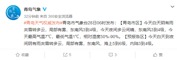 【青岛市区】今天白天阴有雨夹雪转多云,局部有雾,东南风3到4级,今天夜间多云间晴,东南风3到4级,,相对湿度50%-90%。