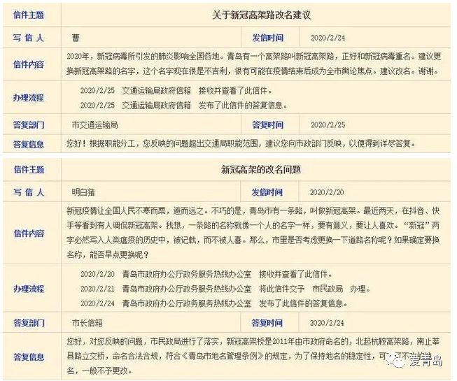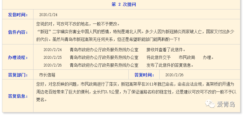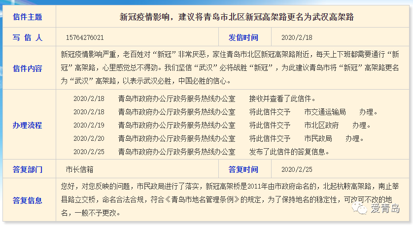 还有人建议将“新冠高架路”更名为武汉高架路。青岛市长信箱给了类似的答复。↓↓↓